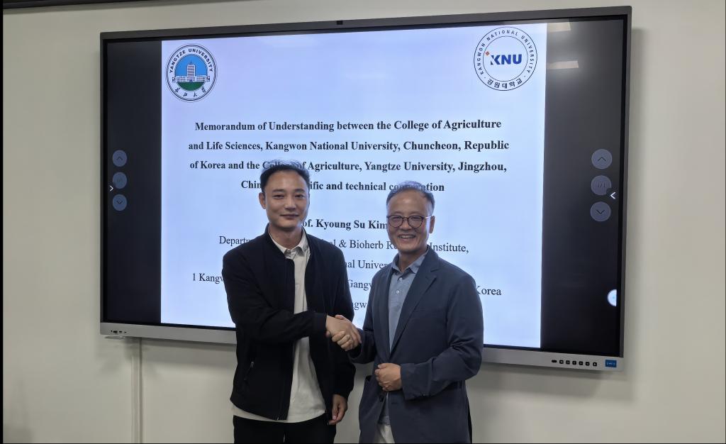 随后,付腾副教授与Kim教授围绕联合科研、师生交流及人才培养等议题进行了探讨,并就未来合作达成共识。双方正式签署合作谅解备忘录,为推动长江大学与韩国江原国立大学建立长期稳定的合作关系奠定了坚实基础,助力植物保护的国际交流与学科发展。