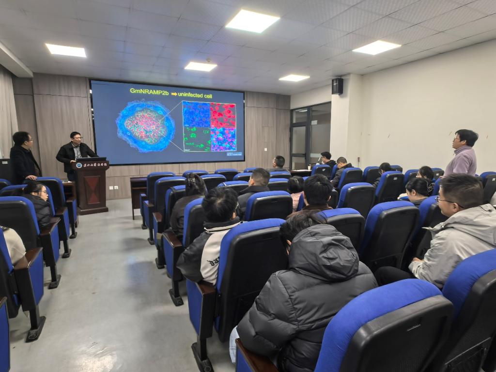 陈志长研究员为全院师生带来了题为 “矿质营养与大豆共生固氮” 的高水平学术报告。报告中,陈研究员依托深厚的学术积淀与多年科研实践经验,系统阐释了铁、镁、硫三种矿质元素在大豆根系根瘤中的关键作用,详实介绍了多种矿质元素转运蛋白参与根瘤固氮过程的分子机制与调控路径。报告内容扎实饱满、逻辑严谨清晰,引发在场师生的广泛关注与深入思考。互动环节中,与会师生围绕 “根瘤菌衰老相关活性氮的来源”“中微量元素耗竭与连作障碍防控” 等研究热点及应用瓶颈踊跃提问,陈研究员对每个问题均给予细致耐心的解答,还毫无保留地分享了其团队挑战学术权威的科研经历与宝贵心得。