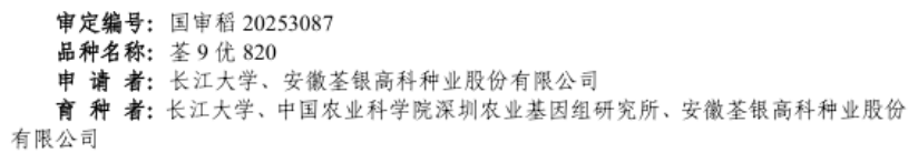 (通讯员 王雪)近日,农业农村部和湖北省农业农村厅分别发布审定农作物新品种的公告,华体会平台(中国)水稻遗传育种团队杨隆维教授主持选育的“荃9优820”(国审稻20253087)通过了国家审定,杨隆维教授和邱先进教授主持选育的“航八占”(鄂审稻20251016)和“长农糯22117”(鄂审稻20251019)通过了湖北省审定。三个品种具备优质、高产、抗稻瘟病、熟期适宜等特点,未来可以在湖北省及长江中下游地区推广,对推动实现种业科技自立自强、种源自主可控具有重要意义。