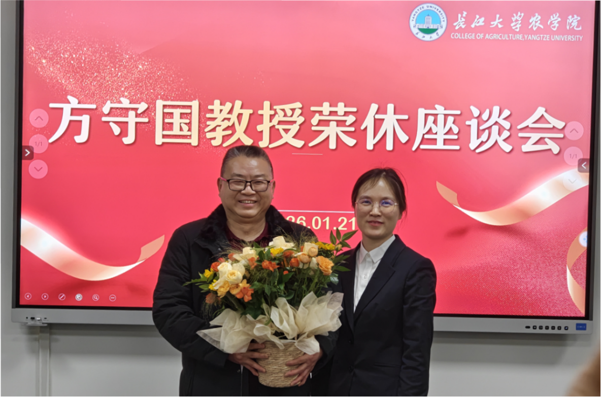 座谈会在张运波院长的致辞中启幕。他深情回溯了方教授从青丝到白发的耕耘足迹,从国内苦读到海外求知,最终扎根长江大学沃土,将半生献给农学教育。院长赞誉其科研坚守,生动诠释农科人吃苦耐劳的精神内核,并代表学院祝愿方教授退休生活丰富多彩,常回家看看。青年教师代表程晓琴献上馥郁花束,课题组新进教师龚攀与其博士生张明静送上荣休蛋糕,在甜蜜分享中传递全院师生的崇高敬意。