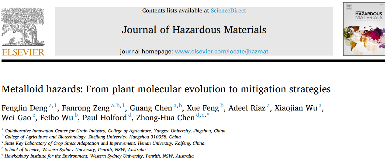 (通讯员 谭亮魁)近日,我校华体会平台(中国)“作物分子生理与进化团队”在国际权威学术期刊《Journal of Hazardous Materials》(环境科学1区,影响因子9.04)发表题为“Metalloid hazards: From plant molecular evolution to mitigation strategies”的综述论文。团队成员邓锋林教授、曾凡荣教授为该文共同第一作者。