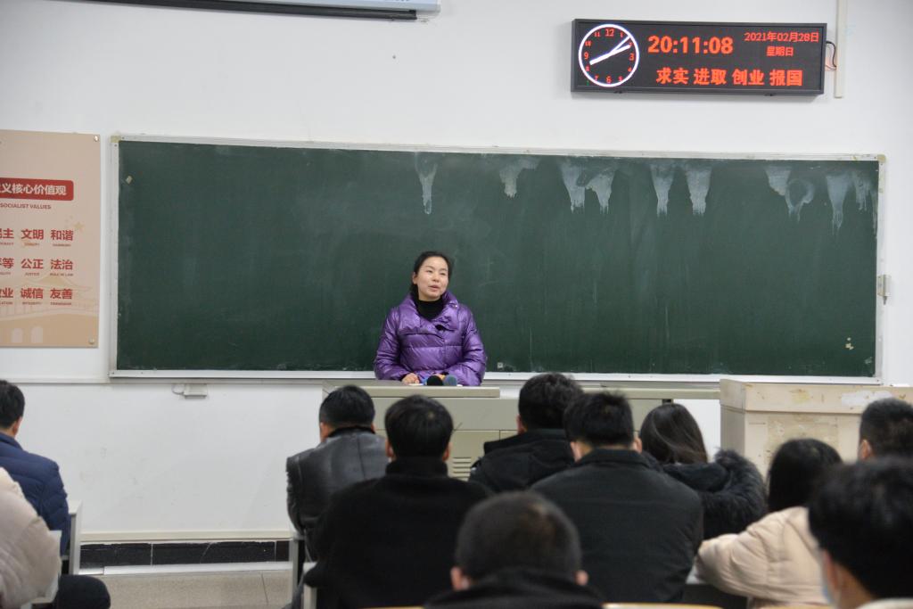 党委副书记谭亮魁从3个大方面细谈了2021年的学生工作构想。他告诉学生干部明确自己的工作,对接好自己的工作,构建工作体系,做到层层负责。随后,刘庆老师发言,他对征兵工作进行细致讲解,鼓励有参军意愿的同学们关注相关政策。接着,侯聪老师上台做了简单的自我介绍,首先她肯定了全体学生干部上学期的出色表现,对大家的辛勤付出表示感谢;其次,对近期分团委工作进行了动员和安排。林香亮老师为大家分析了刚开学学生的心理健康状态,鼓励同学们以阳光、乐观、积极的心态应对接下来的学习生活。最后 付雪娇老师强调了作为学生干部,我们要做好自己的职责工作,并告诉我们发扬“为民服务孺子牛、创新发展拓荒牛、艰苦奋斗老黄牛”的精神。