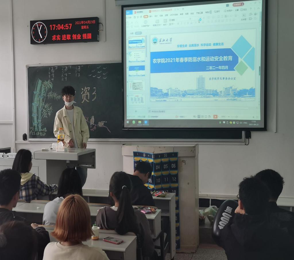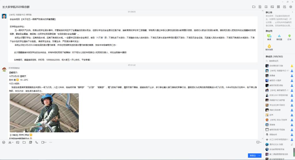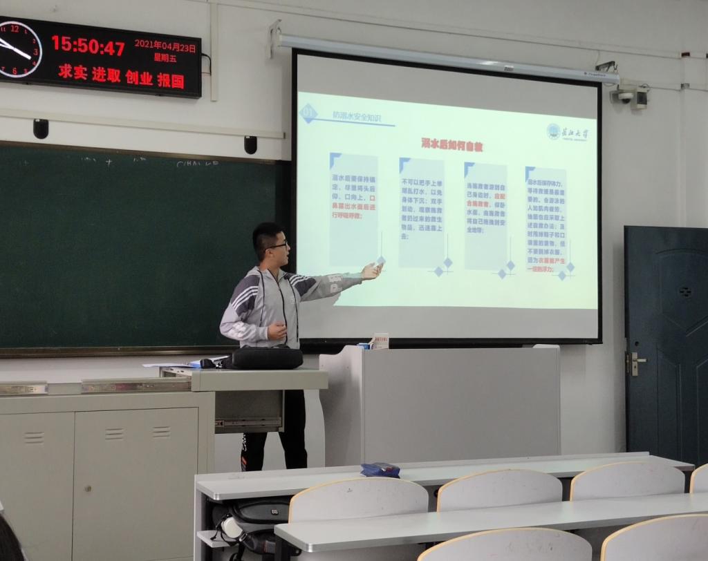 班会结束后,院党委副书记谭亮魁联合分管辅导员,通过QQ群消息等方式深入、全面提醒同学们同学们“五一”期间要远离危险水域,远离不熟悉的水域,警惕溺水事件的发生。一定要牢记防溺水安全常识,做到“六不准”,即:不准私自下水游泳;不准擅自与他人结伴游泳;不准在无家长或老师带领的情况下游泳;不准到无安全设施、无救援人员的水域游泳;不准到不熟悉的水域游泳;不准不会水性的学生擅自下水施救。