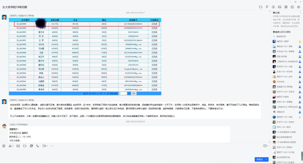 在此期间,我院党委副书记谭亮魁通过发布群通知和公告,向大家广泛传授“什么是电信诈骗”、“电信诈骗的特点”、“诈骗的危害”、“如何防范电信网络诈骗”以及有关“校园贷金融风险防范”等相关知识。结合最近几起比较严重的诈骗案件,谭亮魁为同学们分析了诈骗手段以及诈骗心理,认真讲解“安全防范诈骗提示”,教育大家如何防范诈骗,提醒同学们增强安全防范意识,保护财产安全。