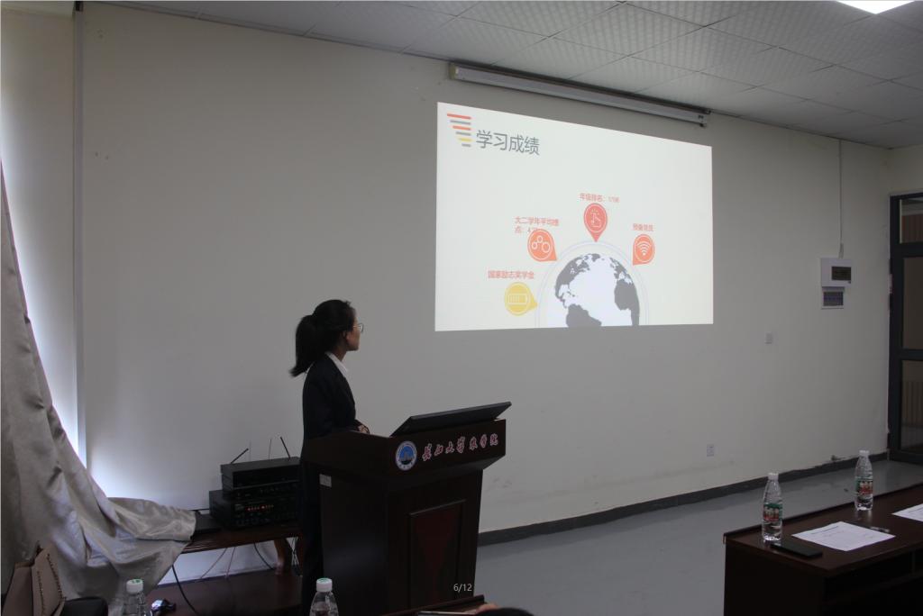 经个人申请、学工办初审、学院审核等环节,优秀本科生朱梦珍、胡洋、赵雯、张春梅、张莹莹、程风杰六位同学入围了此次答辩。在主持人付雪娇老师宣读了答辩要求和评分规则后,参加答辩的各位同学按抽签顺序以PPT演说形式进行自我展示及现场答辩。