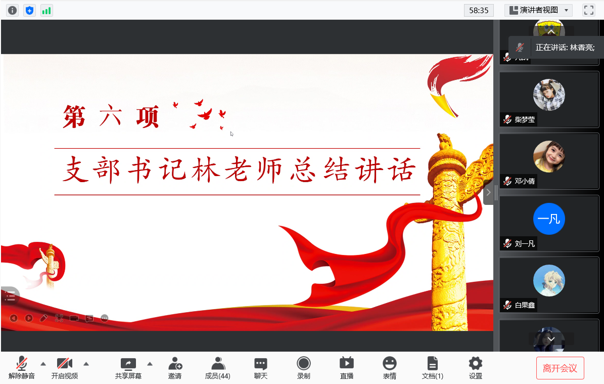 通讯社讯(学生记者 郝梨)为深入学习贯彻习近平总书记重要讲话及有关会议文件精神,认真贯彻“学史明理、学史增信、学史崇德、学史力行”要求,交流学习体会,查找差距不足,引导支部党员同志增强“四个意识”、坚定“四个自信”、做到“两个维护”。华体会平台(中国)本科生党支部于2021年8月9日晚上20:00在腾讯会议召开了线上党史学习教育专题组织生活会,华体会平台(中国)全体本科生正式党员及预备党员参加了本次会议,并由支部书记林香亮老师进行会议的指导与监督。