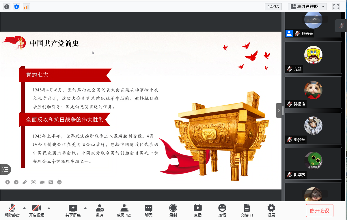 会议伊始,首先由主持人唐海洋同志领读入党宣誓词,接着分别由牟春霓同志介绍学习习近平总书记在庆祝中国共产党成立100周年大会上的重要讲话、张大弘同志介绍学习《中国共产党简史》中的指定内容“党的七大”和“全面反攻和抗日战争的伟大胜利”。介绍的同志介绍得很详细认真,其余得同志听得也挺认真,并在会议进行第四项时,积极发言谈了自己的学习感悟。