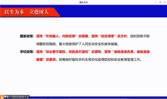 接着,付老师介绍了暑期留校学生情况及离返校管理办法等,叮嘱留校学生严格遵守疫情防控工作规定,非必要不出省,坚决服从学校、当地社区有关疫情防控的安排。随后,付老师就留校纪律提出相应要求,并对人身安全、防电信诈骗、防溺水、食宿、交通等进行了安全教育,对学生在留校期间遇到的问题进行了细心解答,她还要求参会人员对老师布置的工作做好上传下达,对在校生的数据做到心中有数,对学生的动态了如指掌。