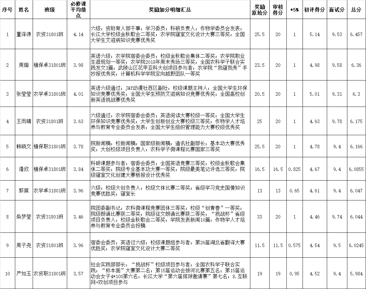 为了树立先进典型,充分发挥典型的教育示范作用,有效激励全院学生勤奋学习,形成积极进取、学习先进、崇尚先进、争当先进的良好风气,促进学生全面发展和成长成才,经个人报名、资格审核、个人展示、面试答辩等程序,拟推荐董泽涛、周璇、张莹莹、王雨晴、韩晓文、潘欣、郭展、柴梦莹、周子尧和严如玉10名同学为本届“十佳兴农青年”候选人。