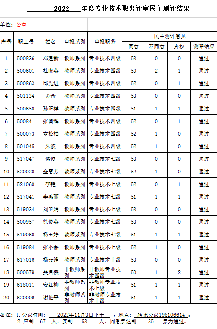 2022年11月3日下午召开2022年度职称评审民主测评会议,根据学校有关要求,进行结果公示。参加测评人员应到67人,实到53人,具体测评结果见附件。