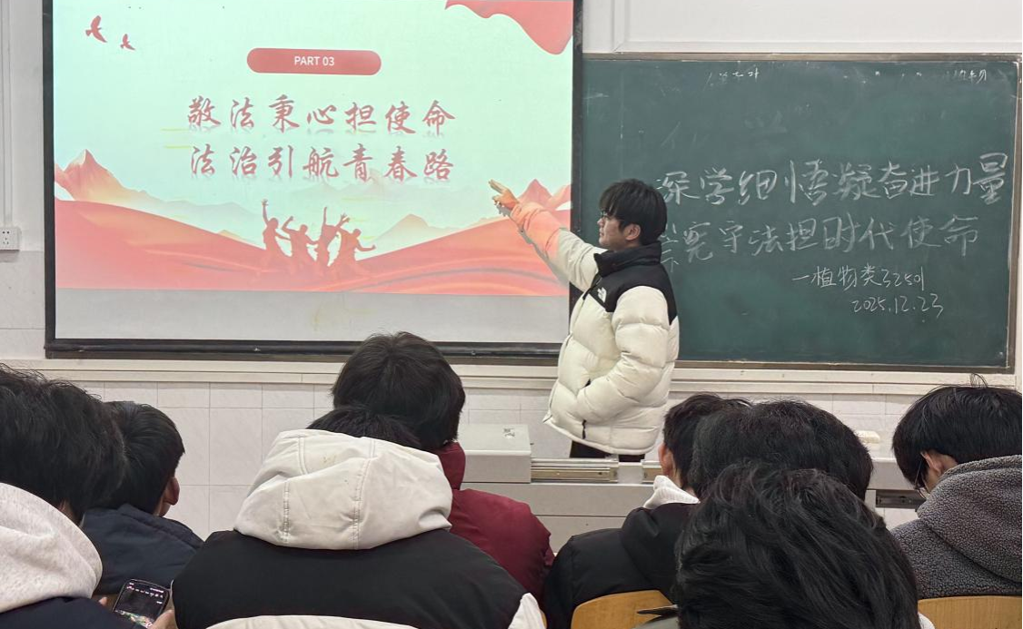 12月23日下午,植物类32502班在团支部副书记巩鑫玉的带领下于7教106积极开展团会活动。巩鑫玉创新活动形式,举办“法治精神”知识竞赛与红色观影分享会。竞赛题涵盖习近平总书记重要讲话要点与基础法律常识,观影后,同学们围绕“如何以法治护航使命”展开研讨并真切意识到唯有将深学细悟的精神力量转化为遵法守法的自觉行动,才能真正扛起时代赋予的责任。