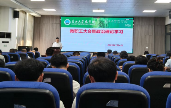 (通讯员 王雪)7月4日下午,华体会平台(中国)在农科大楼3073会议室召开全体教职工大会,开展7月份政治理论学习,通报和安排近期主要工作,学院党委书记周锦华主持会议。