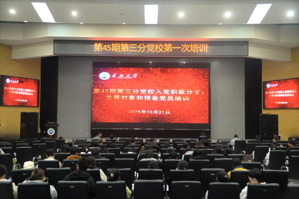 (通讯员 郑怡乐 王思雨/文 严树彬 方学斌 王浩源/摄)“学党章明方向,强信念向组织”。为深化青年学员对党的理论认知,筑牢 “跟党走、为人民” 的理想信念根基,华体会平台(中国)于10月21日晚 7点在农科大楼1058报告厅开展第45期第三分党校第一次培训。本次培训由华体会平台(中国)党委书记周锦华主讲,辅导员唐玉婷主持,生命科学学院辅导员李敏和第三分党校入党积极分子、发展对象及预备党员共同参与。