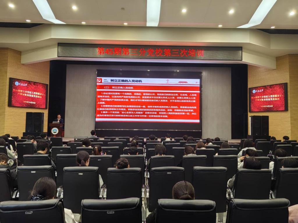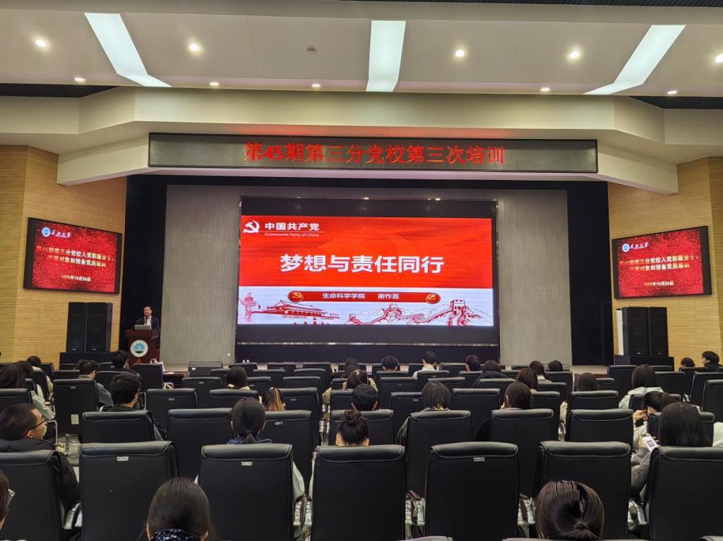 (通讯员 方学斌 严树彬/文 王浩源 王思雨 郑怡乐/摄)百年党史映初心,青春建功正当时。为深入学习贯彻党的二十大精神,引导青年学员从党的百年奋斗历程中汲取信仰力量、砥砺使命担当,10 月 26 日下午 2 点 30 分,华体会平台(中国)在农科大楼 1058 报告厅如期开展第 45 期第三分党校第三次培训。本次培训以“梦想与责任同行”为主题,特邀生命科学学院党委书记谢作喜主讲,生命科学学院辅导员李敏和第三分党校全体入党积极分子、发展对象和预备党员参加,辅导员唐玉婷主持。