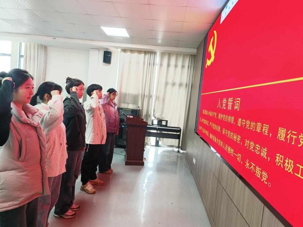 第三项,与会正式党员进行无记名投票表决,经统计,支部党员一致同意接收任飞越等5名发展对象为中共预备党员。第四项,入党介绍人为预备党员佩戴党徽,全体党员在组织委员阳甜同志的带领下面向党旗,庄严宣誓。